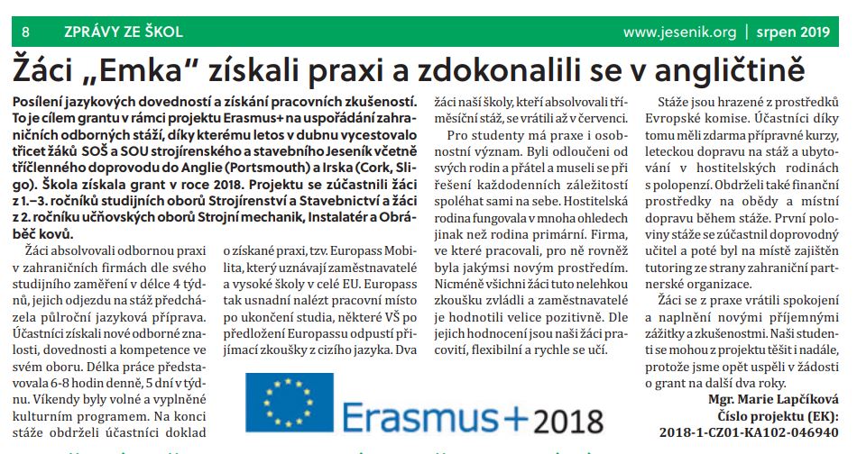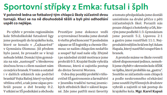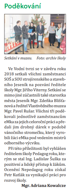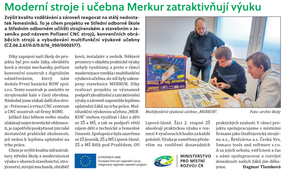Měsíčník MĚSTO JESENÍK - napsali o nás Kamion plný moderních technologií přijel do Jeseníku na Střední průmyslovou školu „Programuj, sestavuj, vyráběj a bav se! A zároveň zjisti, v čem jsi nejlepší.“ To je zásadní myšlenka projektu Tour for the future. Kvalitním vzděláním začíná úspěšná budoucnost a SPŠ Jeseník hledá různé možnosti, jak pozvednout úroveň vzdělávání na Jesenicku. Ve dnech 24. a 25. června zavítala na SPŠ Jeseník mobilní učebna s nejnovějšími technologiemi. Díky podpoře Ministerstva průmyslu a obchodu (MPO) a společnosti VISC měli studenti z jesenické průmyslovky a žáci ze základních škol možnost poznat a vyzkoušet si moderní technologie, jako jsou 3D tiskárny nebo tablety s funkcí rozšířené reality, a zhlédnout expozici pneumatických, hydraulických a elektromagnetických mechanismů. „Jsem nesmírně rád, že se k nám na školu podařilo přivézt kamion s mobilní učebnou. Je velmi důležité žákům základních škol a studentům naší školy ukazovat nové technologie a popularizovat techniku, která je hybatelem pokroku. Věřím, že na to navážeme dalšími počiny,“ uvedl ředitel školy Jiří Viterna. S nápadem mobilní učebny přišel gestor projektu Tour for the future Tomáš Hamberger, který dodal: „Hlavním cílem pojízdné učebny techniky je propagovat technické vzdělávání a řemeslo a vzbuzovat zájem dnešní mládeže o tyto oblasti.“ Dlouhodobým problémem českého školství je nízký zájem dětí o studium technických oborů nebo řemesel. Mobilní učebna chce pomoci tento problém řešit tím, že techniku a řemeslo ukazuje žákům jako velmi moderní, inovativní a perspektivní odvětví, kam se vyplatí směřovat budoucí studijní nebo profesní kroky. V pojízdné učebně v Jeseníku proběhly praktické výukové programy pro žáky a studenty, ale i workshopy pro pedagogy, které byly zaměřeny na kariérové poradenství a techniku s virtuální realitou a 3D tiskem. Jednoho z workshopů se zúčastnili také senátor za Jesenicko a Šumpersko Mirek Adámek, starostka města Jeseník Zdeňka Blišťanová a předseda Okresní hospodářské komory, místní podnikatel Josef Ťulpík. Studenti si v mobilní učebně vyzkoušeli sestavit podle schématu ovládací pneumatický okruh pro pracovní pohyby výrobního stroje, v tomto případě lisu. Tímto si mohli na praktických modelech ověřit své znalosti získané ve výuce a sestavit funkční pneumatický okruh z komponent firmy FESTO, která je výrobcem funkčních částí pneumatických a hydraulických mechanismů. Studenti měli k dispozici zásobník pneumatických válců, rozváděčů, spojek, hadic, ventilů a dalších prvků. Pracovali ve skupinách a postupně na montážní panely připojovali jednotlivé komponenty. „Vždy jsem rád, když učivo, o kterém se bavíme ve škole, vidím přímo v praxi. A největší radost jsem měl, když se lis rozběhl a já jsem mohl vyzkoušet slisovat plechovku,“ dodává nadšeně Viktor Pecina, student SPŠ. „Na podzim chceme tuto učebnu dostat znova do Jeseníku a ukázat dalším žákům a učitelům nové technologie,“ doplňuje ředitel Viterna. Pojízdná učebna techniky umožňuje konání praktických workshopů cílených na prohloubení dovedností žáků a studentů. Bezprostředně na praktickou část navazuje kariérové poradenství pro žáky 8. a 9. tříd, jež se zaměřuje na volbu povolání. Tímto způsobem dochází k propojení světa vzdělávání se světem pracovního prostředí. „V mladých lidech probouzíme chuť na sobě pracovat a pomáháme jim dostat se do nejlepších společností regionu. Umíme v každém objevit jeho schopnosti, silné stránky a potenciál. Nabízíme spolupráci se zajímavými a technologicky vyspělými firmami,“ popisuje náplň kariérového poradenství psycholožka Sylva Štěpitová z VISC. Tato společnost, která přivezla mobilní učebnu do Jeseníku, se zabývá modernizací výukových forem a spolupracuje s ministerstvem průmyslu a obchodu na popularizaci a zatraktivnění technických oborů v oblasti vzdělávání. SPŠ Jeseník Poradenství v oblasti tělesné výchovy a mládeže 01/2021 Střední průmyslová škola Jeseník společně s fakultou Aplikovaných pohybových aktivit (APA) při Univerzitě Palackého v Olomouci uzavřely dohodu o vzniku detašovaného pracoviště zaměřeného na poradenství v oblasti tělesné výchovy v našem regionu. V úterý 30. listopadu se sešli vedoucí Centra APA Ondřej Ješina a ředitel SPŠ Jeseník Jiří Viterna a dohodli se, že SPŠ Jeseník se stane vlajkovou lodí Olomouckého kraje v oblasti vzdělávání v APA. Hlavním smyslem a cílem Centra APA je zvýšit a zkvalitnit život žáků, studentů se speciálními potřebami (postižením, znevýhodněním, dlouhodobou nemocí) a začlenit tyto jedince prostřednictvím sportu mezi ostatní. „V rámci projektu jsme se zavázali organizovat a metodicky podporovat školy, pedagogy, kteří se rozhodli aktivně a smysluplně začleňovat své handicapované žáky do hodin tělesné výchovy. Tento krásný a zajímavý region jsme zvolili zejména pro jeho polohu a nabídku pestrých sportovních aktivit,“ říká Ondřej Ješina, vedoucí centra APA a zástupce vedoucího katedry APA na UP Olomouc. Pracoviště bude sloužit zejména ke sdílení a výměně zkušeností pedagogických pracovníků v oblasti rozvoje pohybové gramotnosti. Chtěli bychom pořádat semináře, ve kterých se pedagogové naučí, jak a jakým způsobem začlenit právě tyto žáky a studenty do hodin tělesné výchovy. „Cílem projektu je zvyšovat odbornost tělocvikářů, nejen u nás, ale také na Šumpersku, kam bude mít projekt naší školy přesah,“ uvádí učitelka tělesné výchovy a konzultantka projektu