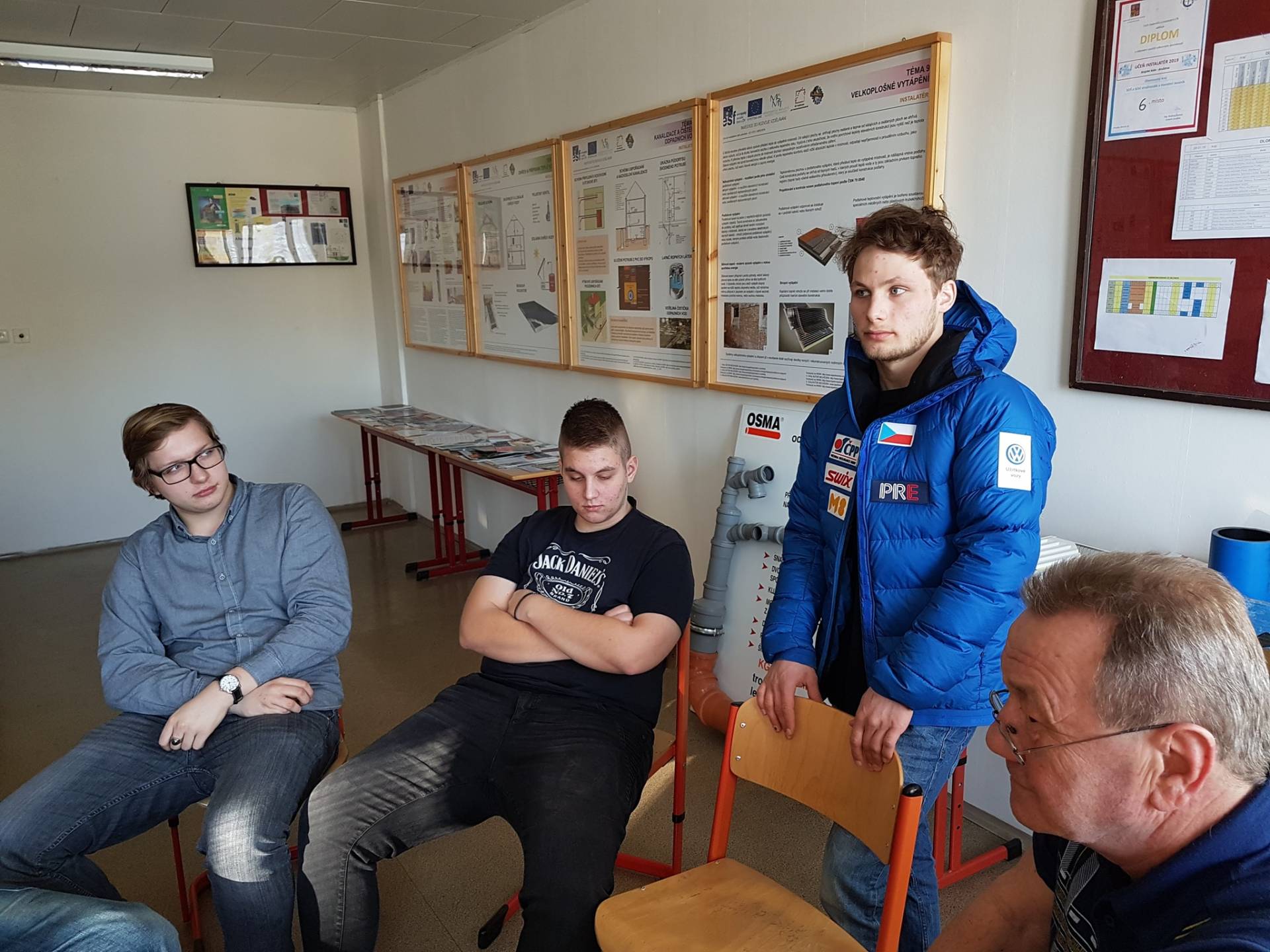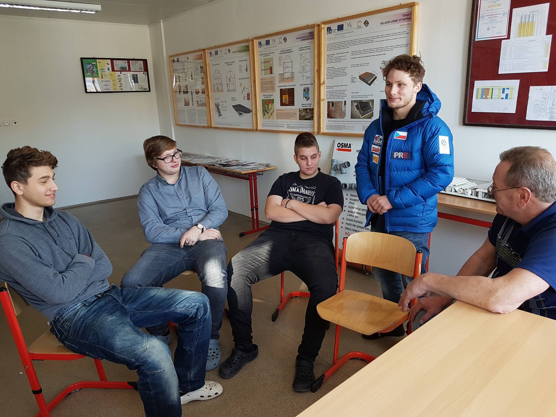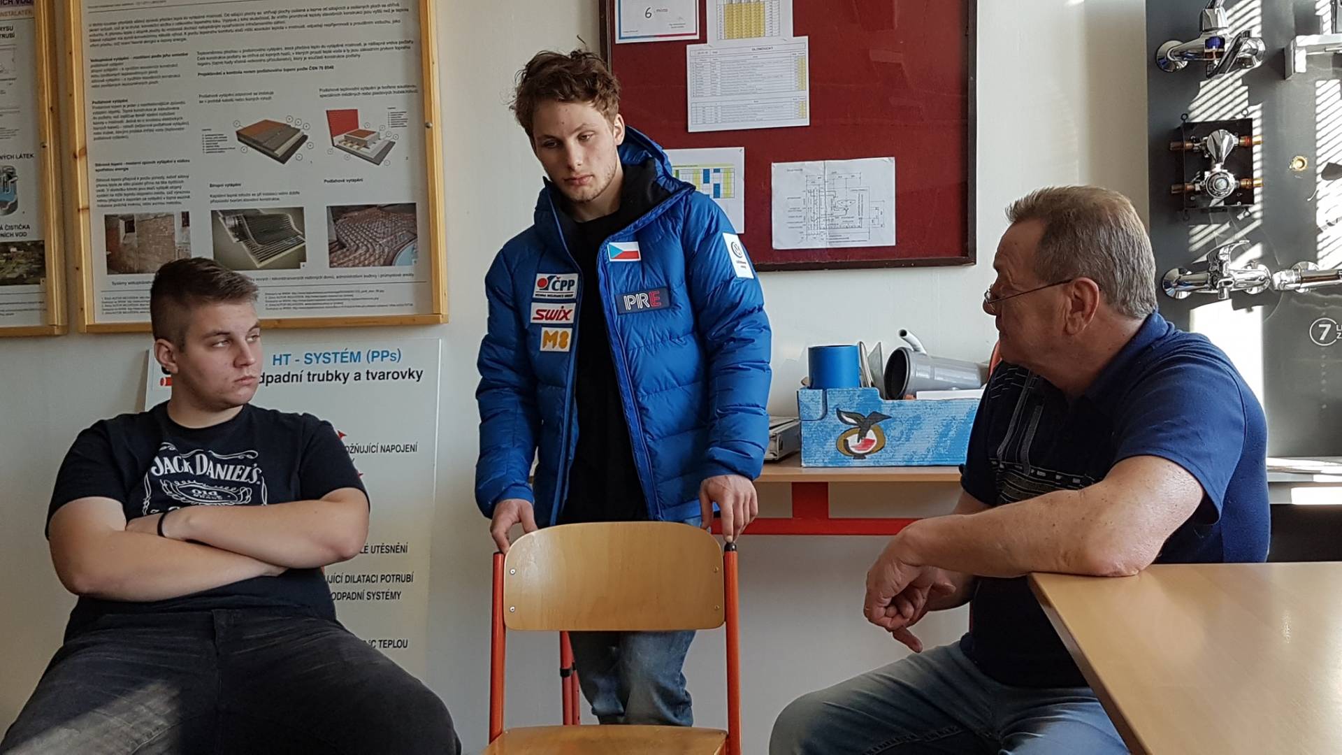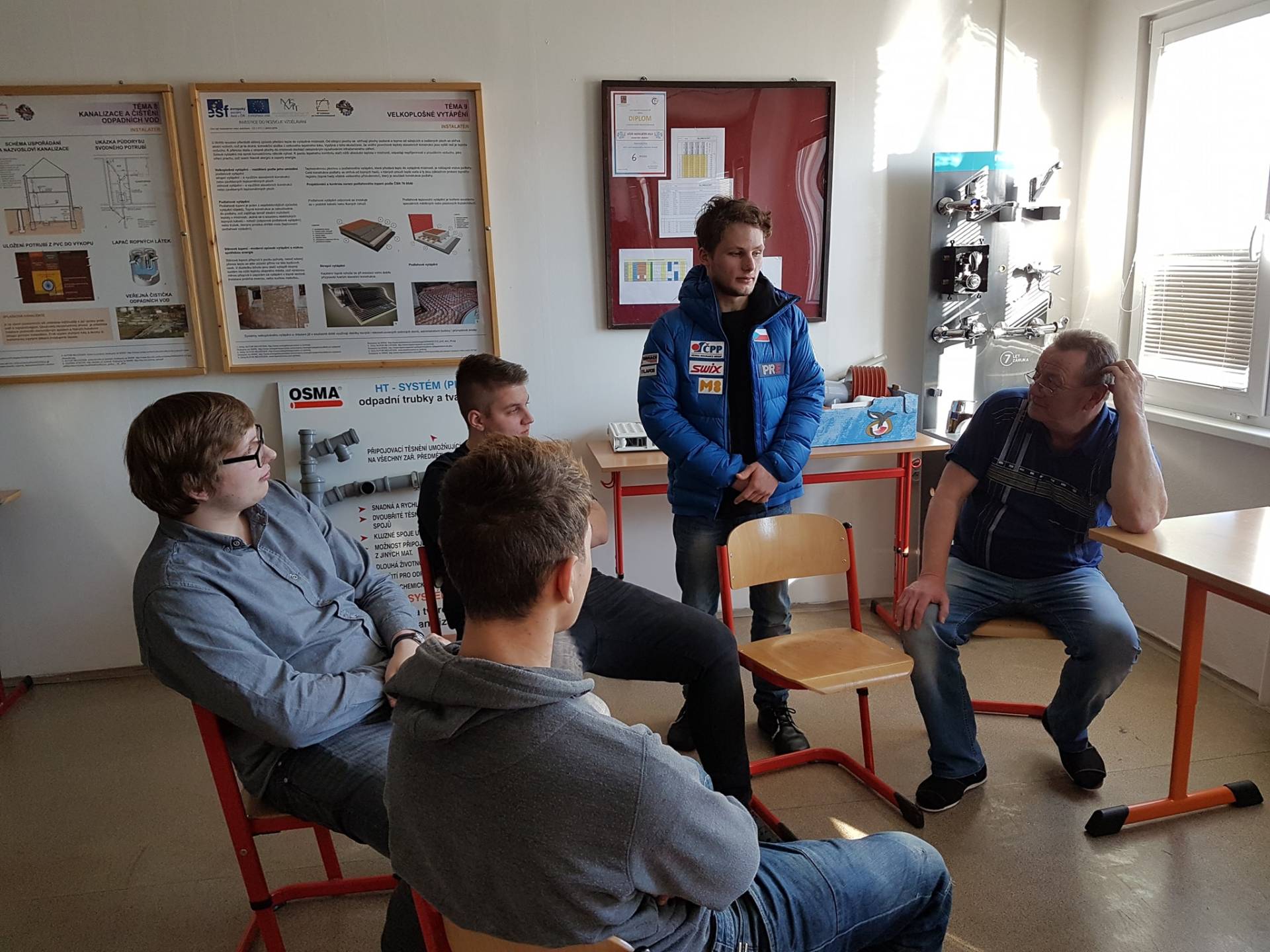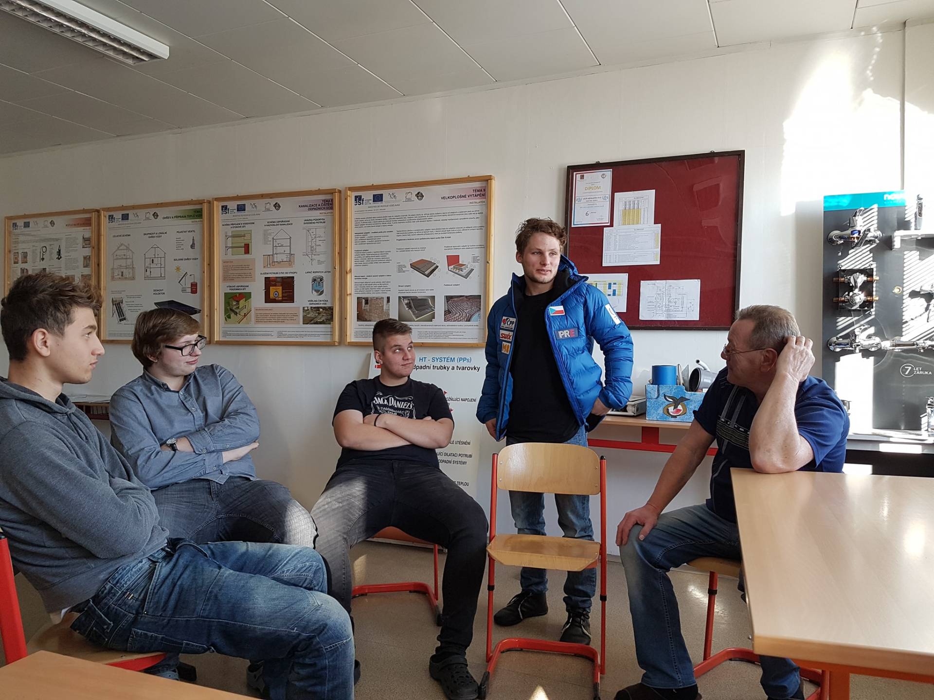 Náš student Vladimír Kozlovský, který se letos v lednu umístil na juniorském MS v klasickém lyžování na úžasném 12. místě, se zastavil mezi závody na skok ve škole. Se svými sportovními zážitky a plány do budoucna se podělil se svými spolužáky a třídím učitelem Ing. Ladislavem Šuškou.