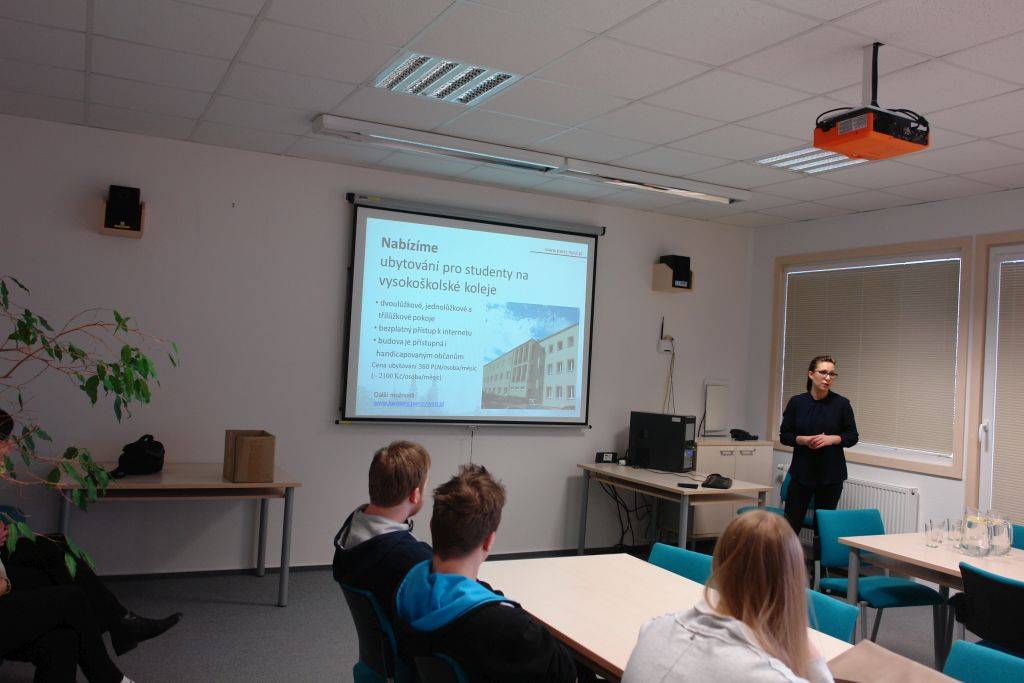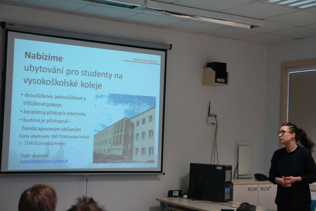Pokud máte rádi výzvy, pak jednou takovou je vysokoškolské studium v polské Nyse. Její zástupci přijeli prezentovat univerzitu i nám a naše maturanty zaujali svou pestrou nabídkou studijních oborů. Jedním z velkých plusů je absence přijímaček, naopak studium probíhá v polském jazyce. Ale univerzita s touto jazykovou bariérou počítá a bude vám ve všech ohledech zpočátku nápomocna tak, aby abyste tuto počáteční "překážku" překonali.