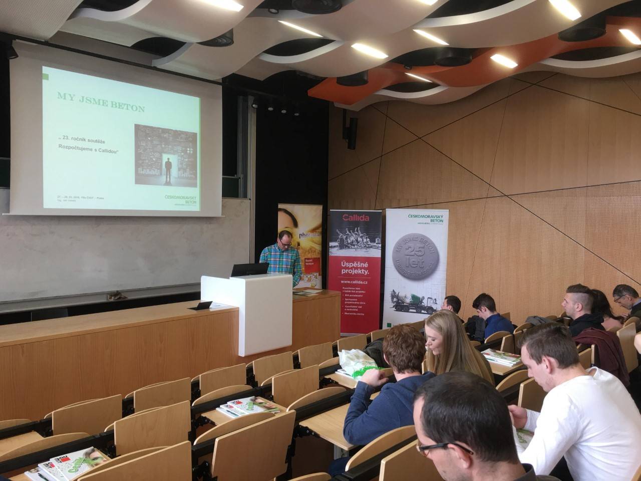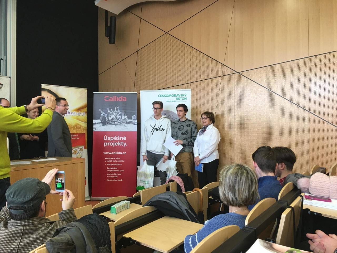 V úterý ráno jsme se z kolejí přesunuli do budovy ČVUT fakulty Stavební a v 9 hodin, po úvodních slovech pořadatelů, začalo klání mezi dvoučlennými týmy studentů z 10 středních škol z celé republiky. Zadání soutěže bylo velmi náročné a těžké a navíc velmi zlobila technika. Některé týmy nemohly pracovat až 70 minut z celkového času 180 minut. Nakonec pořadatelé přidali ještě 30 minut. Po vypracování úkolů jsme se odebrali na oběd do menzy a mezitím zadavatelé opravovali práce. Po obědě byly pro všechny zúčastněné připraveny přednášky hlavních sponzorů soutěže, firem Českomoravský beton a Baumit.