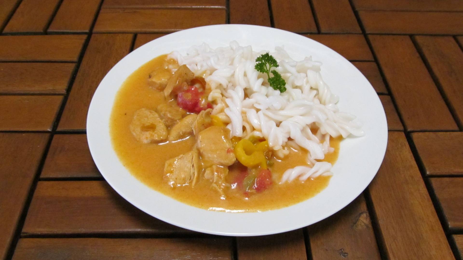 kuřecí paprikáš, rýžová vřetena s kurkumou