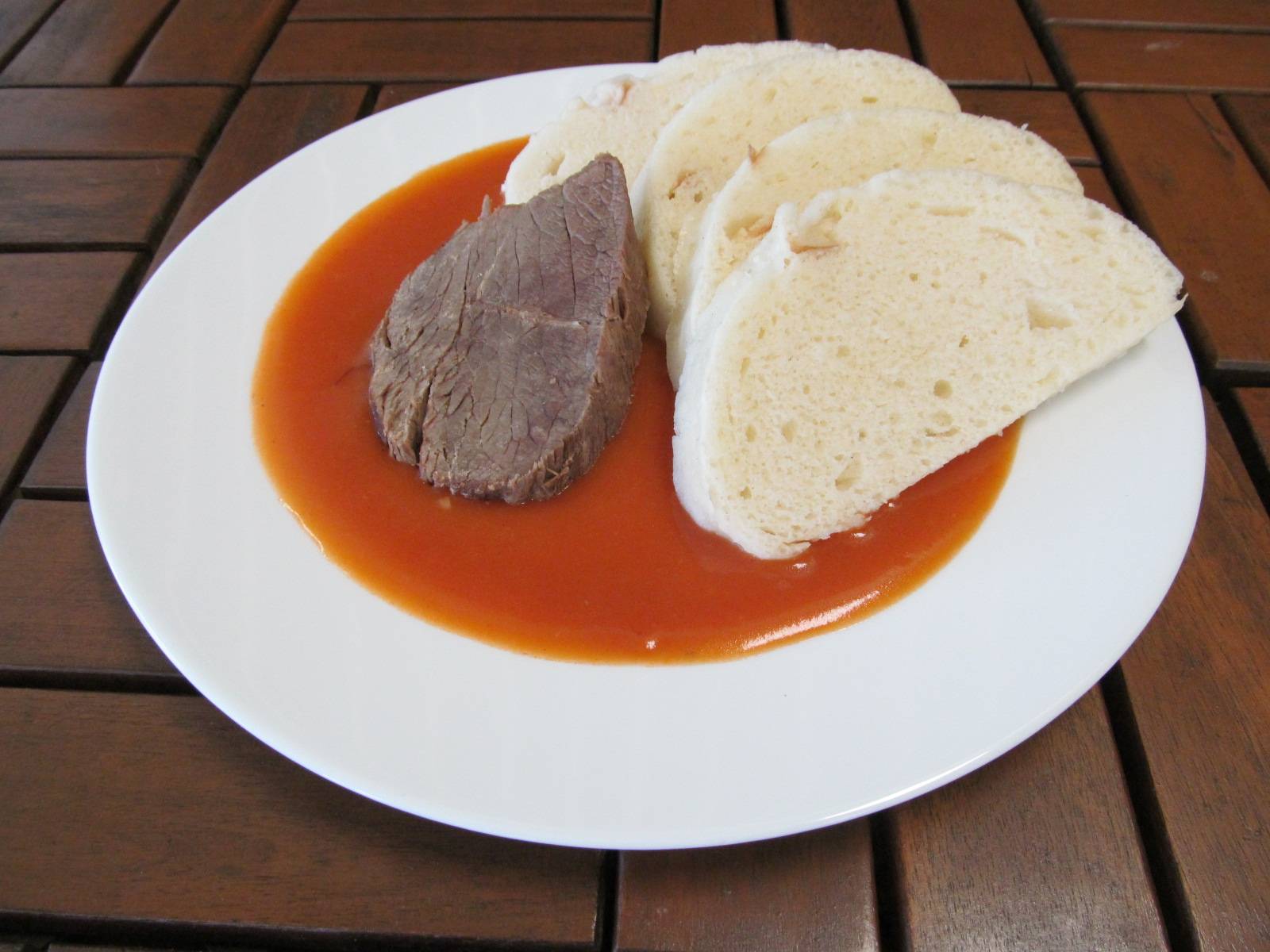 dušené maso hovězí, rajská omáčka, houskové knedlíky