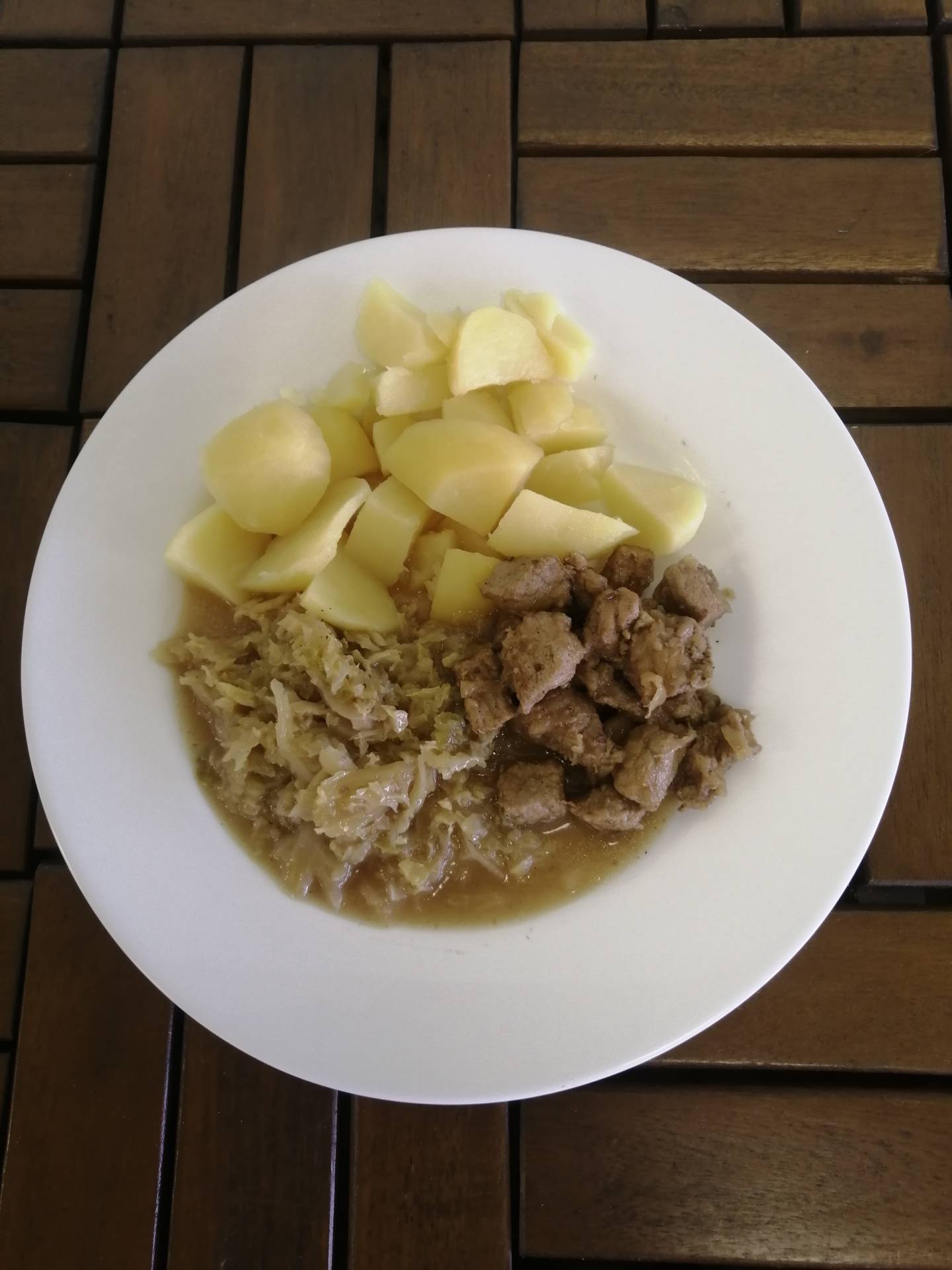 vepřové kostky, dušená kapusta, vařené brambory (Hlavní chod)