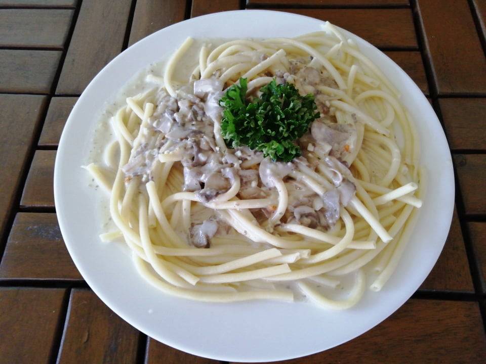 makarony se sýrovou omáčkou a žampiony