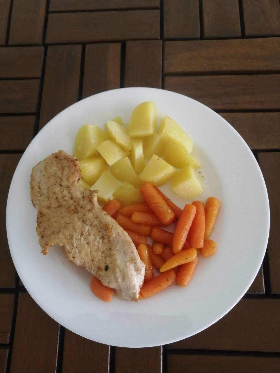 přírodní kuřecí plátek, baby mrkev, vařené brambory