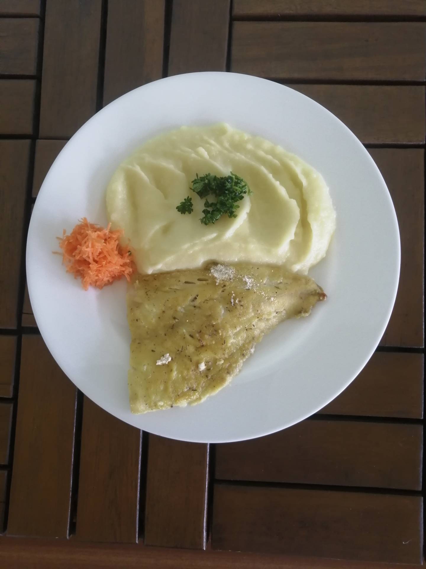 Treska v bylinkové krustě, Bramborová kaše (Hlavní chod)