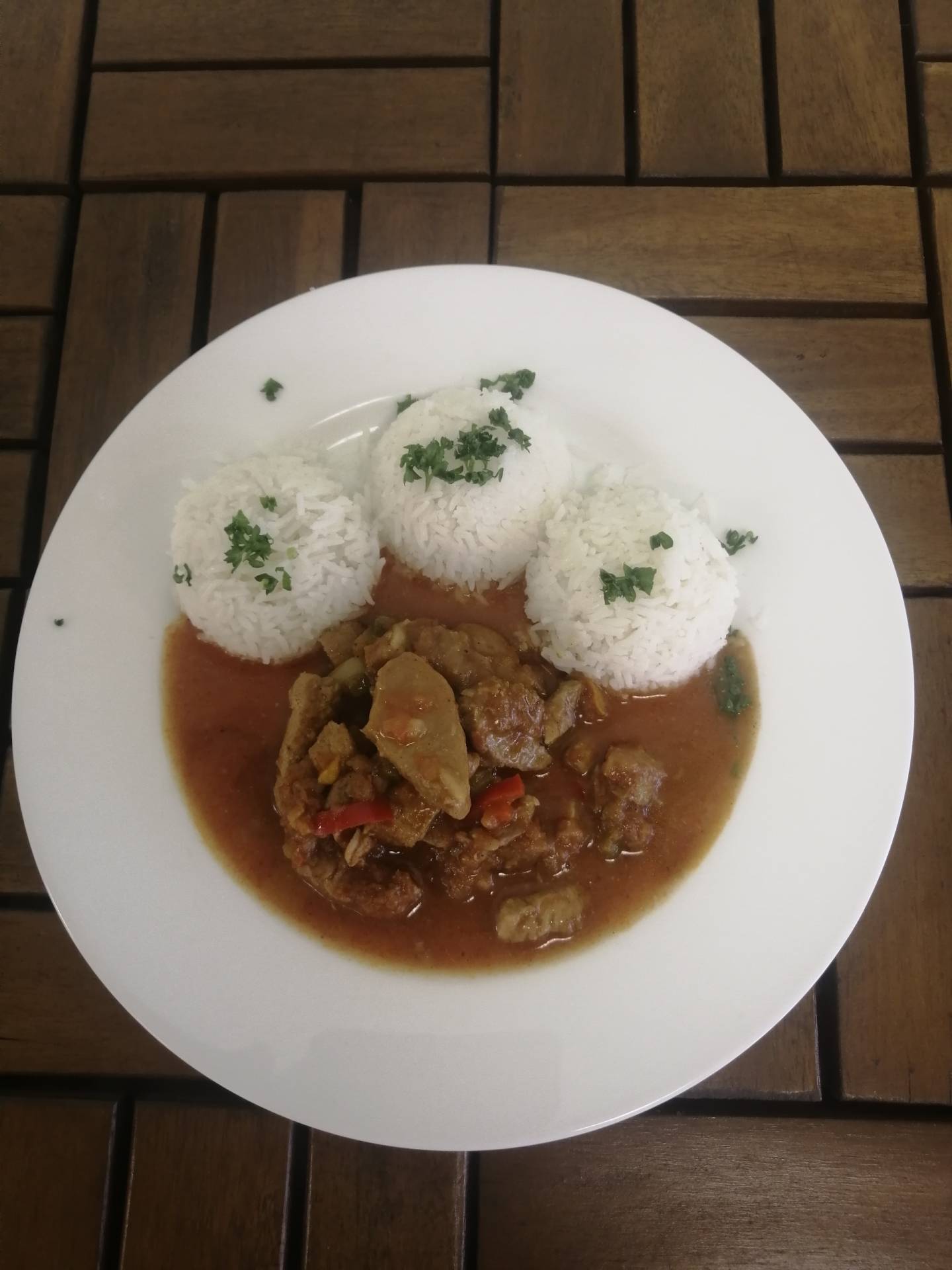 pražský flamendr ( vepřové maso, drcená rajčata, paprika ), dušená rýže