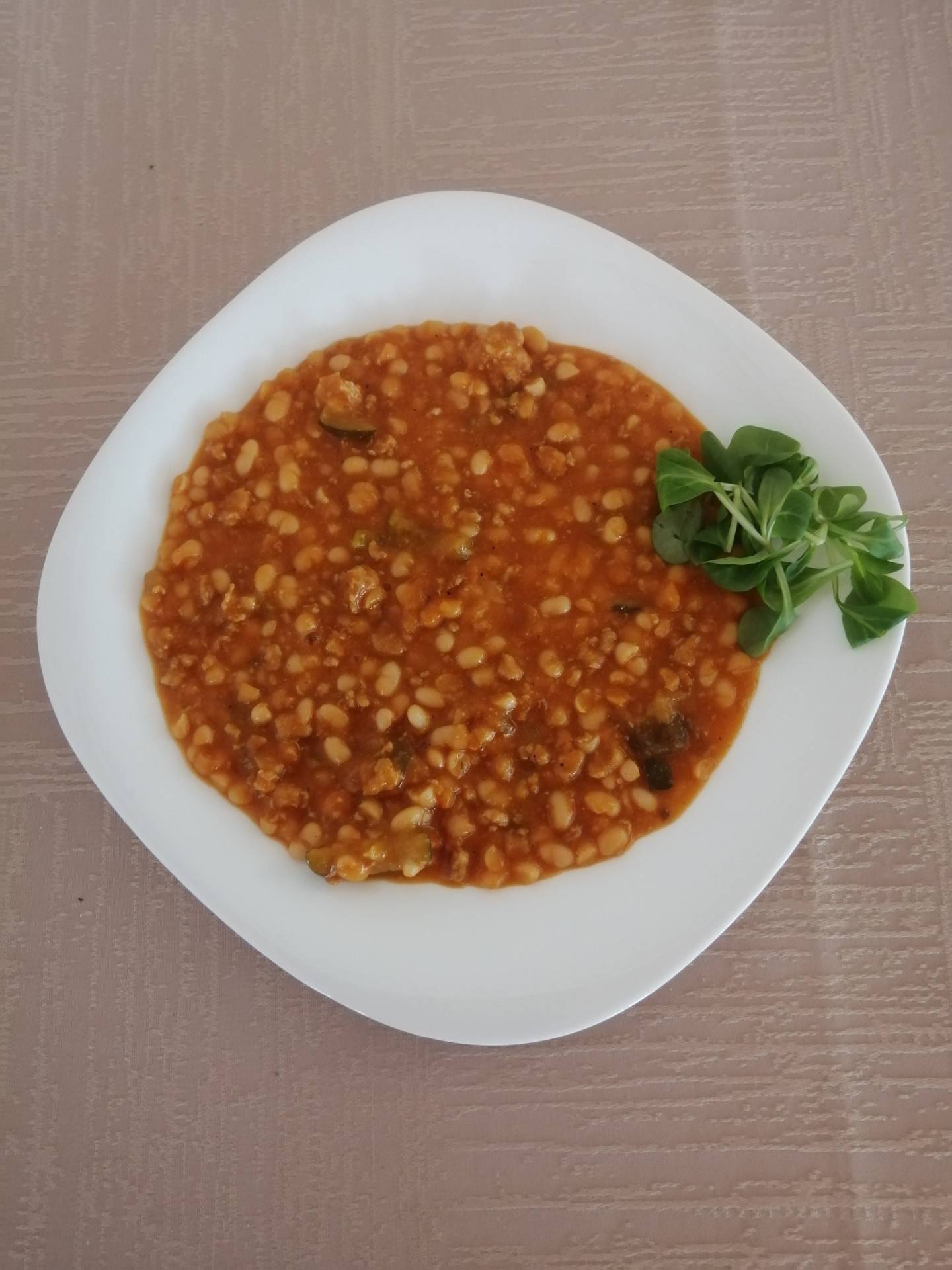 pikantní fazole s mletým masem a zeleninou, chléb (Hlavní chod)