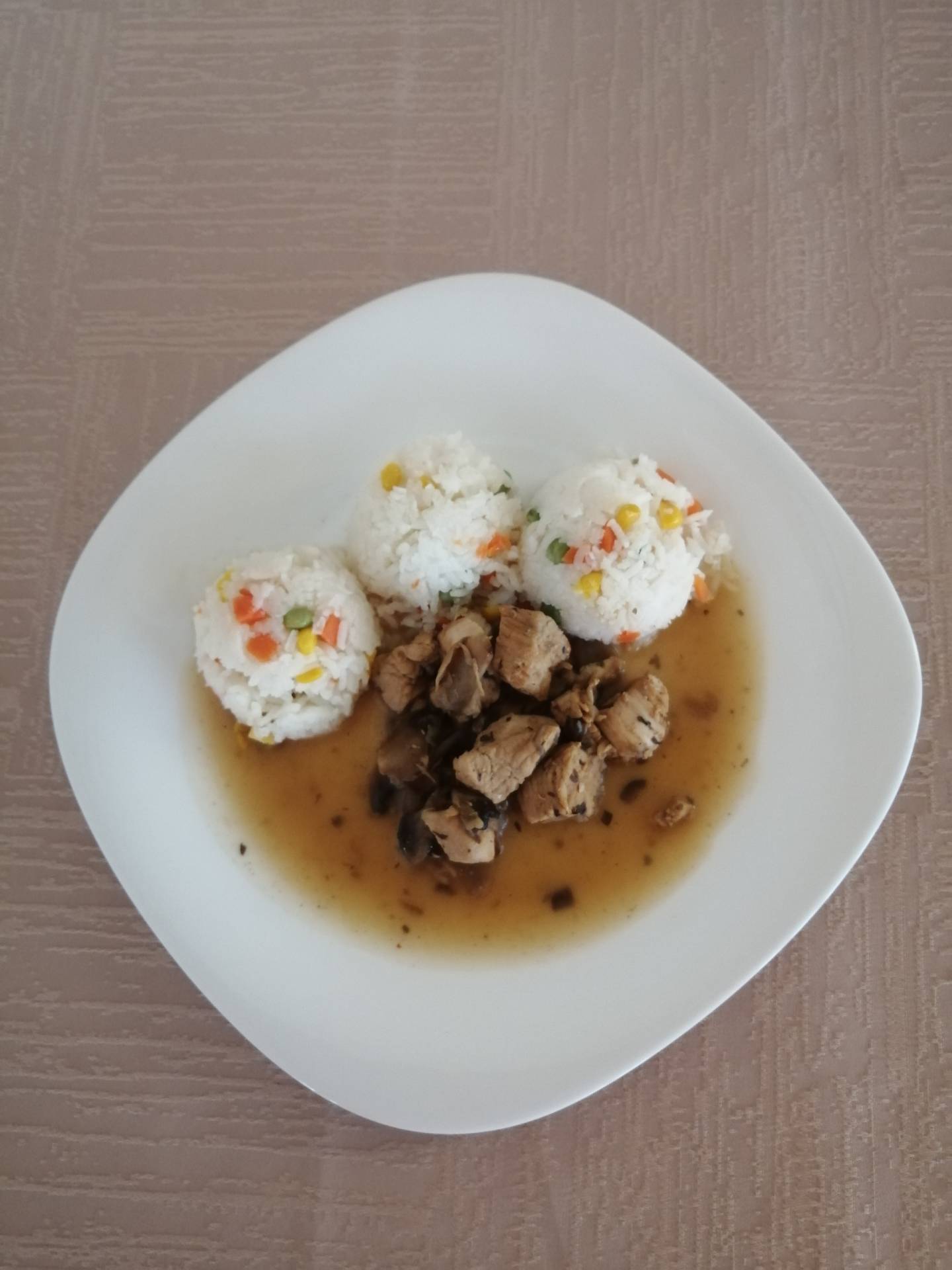 krůtí maso na žampionech, zeleninová rýže (Hlavní chod)