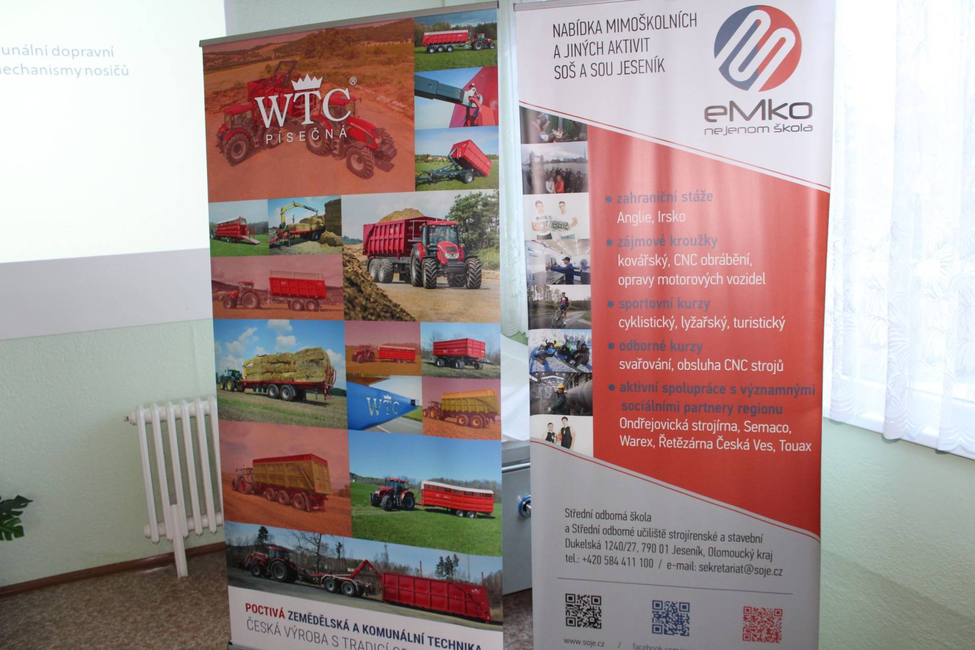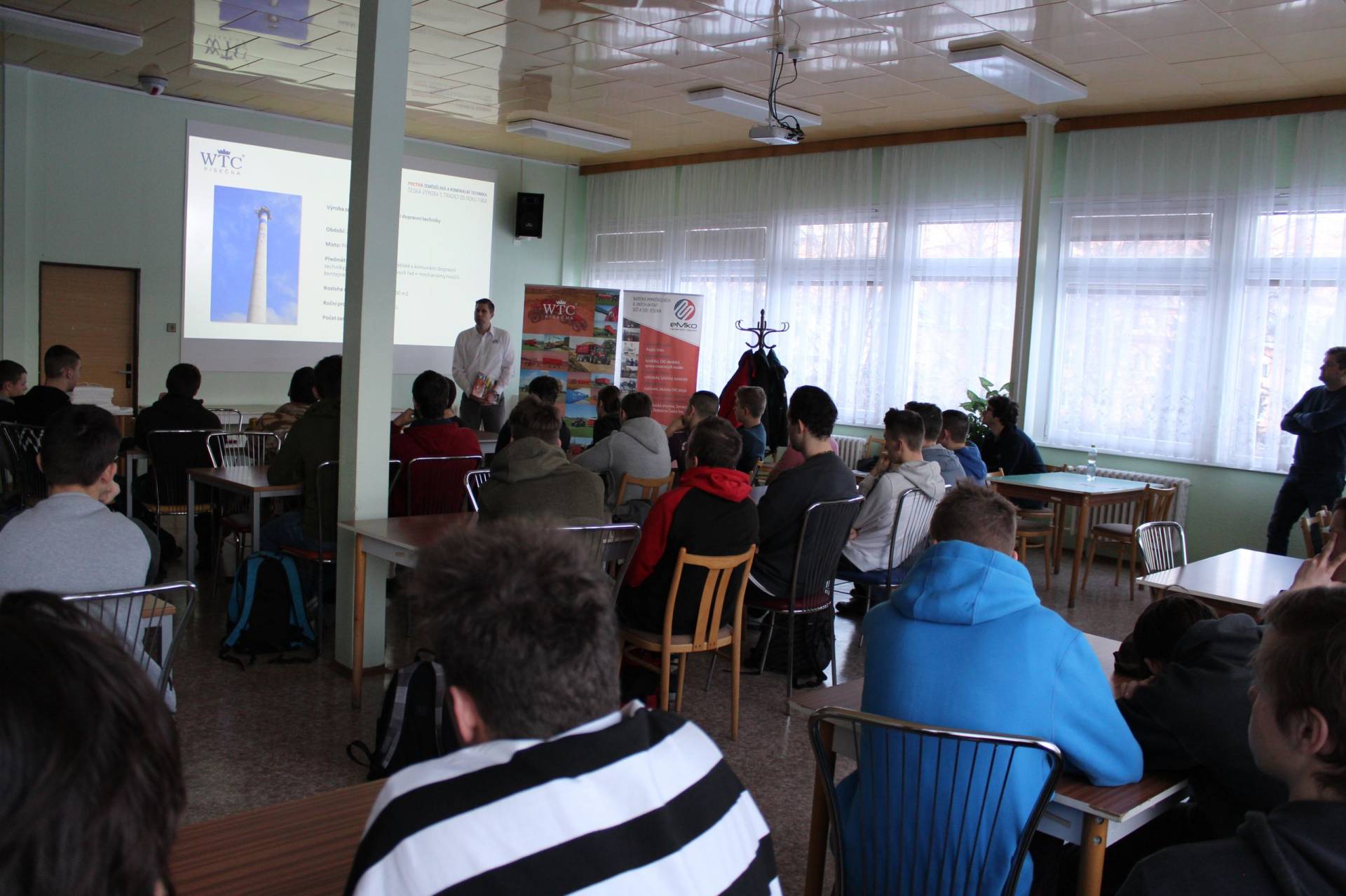 Firma WTC Písečná s.r.o.Ptáte se co má společného firma WTC Písečná s.r.o. a SOŠ a SOU strojírenské stavební v Jeseníku neboli eMko? Můžeme Vám prozradit, že společných aktivit spolupráce mezi progresivní firmou a eMkem je celá řada, počínaje odbornou praktickou výukou žáků v reálném prostředí firmy, výrobou jednoduchých strojních součástí v rámci produktivní práce žáků, vzděláváním pracovníků firmy (svářečů) ve svářečské škole atd. Díky spolupráci mezi eMkem a firmou WTC se uplatnila více než desítka absolventů technických studijních a učebních oborů na pracovních pozicích v konstrukci a výrobě. Úspěšnou spolupráci chceme dále rozvíjet, a proto jsme počátkem letošního roku zorganizovali prezentaci firmy WTC Písečná s.r.o. v prostorách školy, které se zúčastnili žáci a pedagogové školy společně se zástupci firmy, ředitelem p. Petrem Kapustou a obchodním zástupcem p. Petrem Kösslerem, kteří představili výrobní program firmy zaměřený na zemědělskou a komunální techniku na vysoké evropské úrovni. Dále představili záměry rozvoje a inovace firmy směrem do budoucnosti. Spolupráci budeme dále rozvíjet a navážeme na ni exkurzí do firmy v průběhu roku 2019.