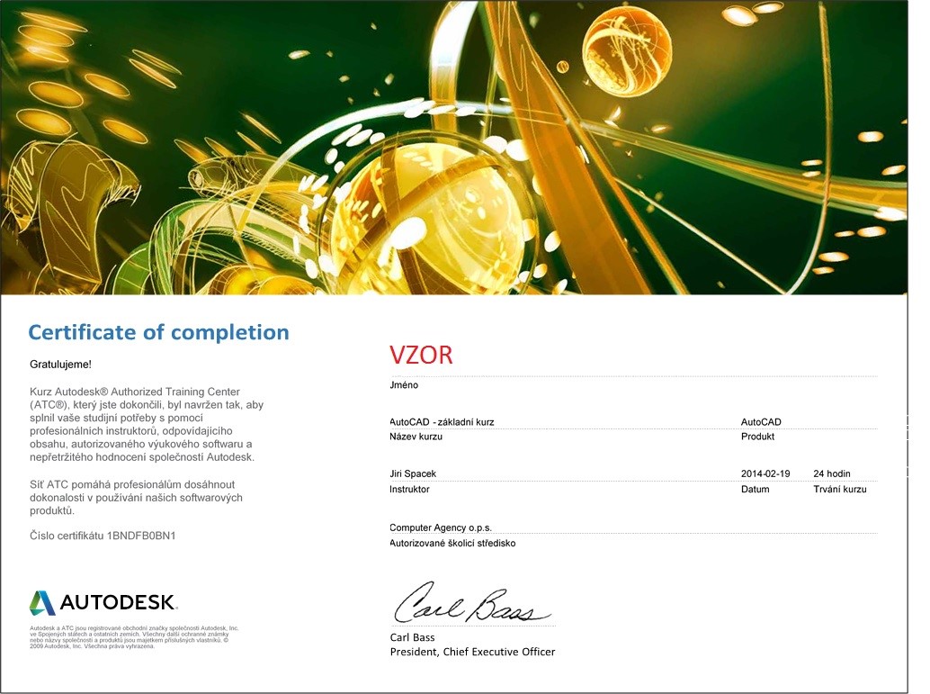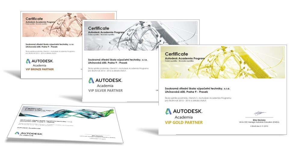 Mezinárodní certifikace studentůVelmi významným benefitem Autodesk Academia programu na naší škole je možnost získat vedle licencí profesního software především mezinárodní certifikaci Autodesk Academia. Pro více informací kontaktujte Ing. Milana Mikulenku nebo Ing. Radka Janhubu. Certifikace je udělována na základě úspěšných studentských projektů.